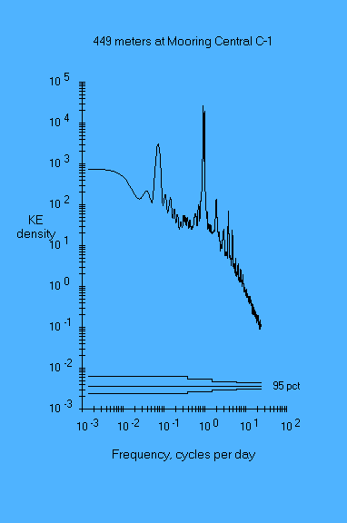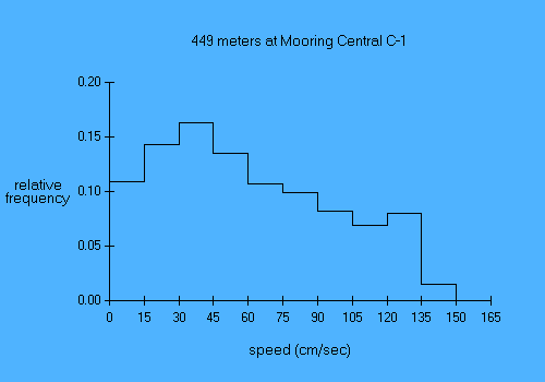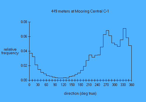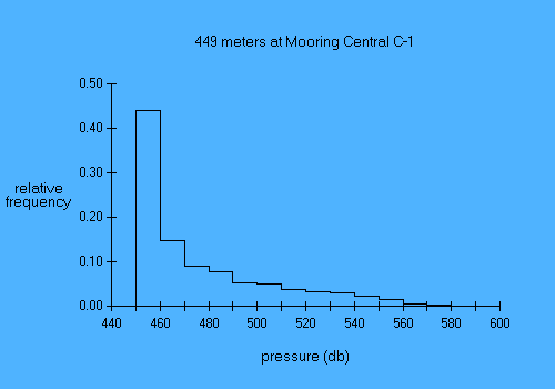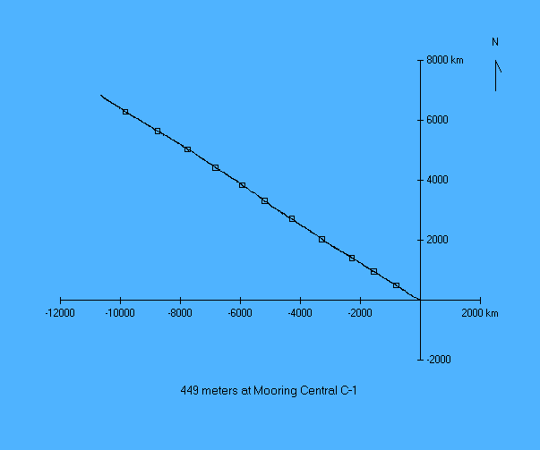 Experiment name: AnSlope 2003-04 Principal Investigator: A.L.Gordon/A.Orsi/R.D.Pillsbury PI's affiliation: LDEO/TAMU/OSU Mooring Name: Central C-1 Mooring position: 72.031 deg S, 173.093 deg E Instrument depth: 449 meters Seafloor depth: 651 meters Times: starts 03 Mar 2003, ends 27 Feb 2004 Time increment: 30 minutes Instrument type: Aanderaa RCM8s parameter min mean max sd days speed (cm/sec) 0.92 60.58 150.32 37.46 361.8 dir (deg true) 0.20 241.74 359.86 101.22 361.8 u (cm/sec) -135.68 -34.15 44.03 35.77 361.8 v (cm/sec) -86.42 21.89 134.93 46.36 361.8 temp (deg C) -1.86 0.62 1.21 0.39 361.8 pressure (db) 454.54 476.87 583.00 27.47 361.8 Pressures recorded by this instrument decreased by about 30 db during the course of the year. How much of this was caused by sensor drift and how much by line stretch is unknown. In the present version of the file this trend has been removed. |