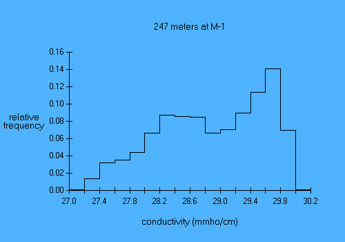 Experiment name: AnSlope 2004-05 Principal Investigator: A.L.Gordon/A.Orsi/R.D.Pillsbury PI's affiliation: LDEO/TAMU/OSU Mooring Name: M-1 Mooring position: 72.097 deg S, 172.695 deg E Instrument depth: 247 meters Seafloor depth: 498 meters Times: starts 08 Mar 2004, ends 02 Feb 2005 Time increment: 30 minutes Instrument type: SBE-37 MicroCat parameter min mean max sd days temp (deg C) -1.88 -0.00 1.26 0.80 331.0 cond (mmho/cm) 27.18 28.89 30.02 0.71 331.0 |