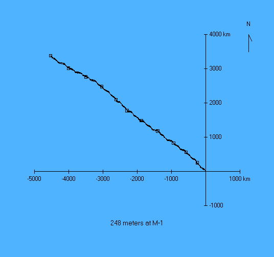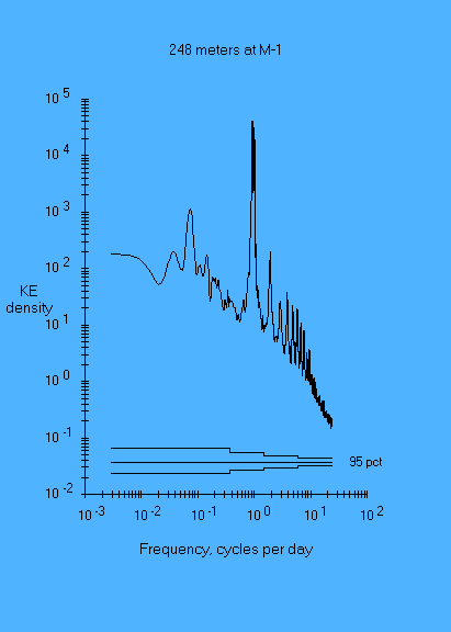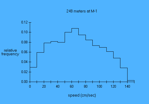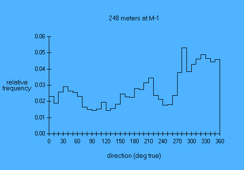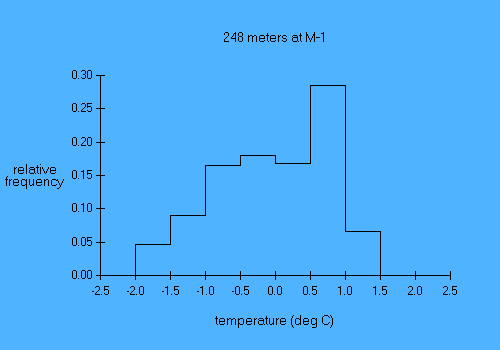 Experiment name: AnSlope 2003-04 Principal Investigator: A.L.Gordon/A.Orsi/R.D.Pillsbury PI's affiliation: LDEO/TAMU/OSU Mooring Name: Central A-1 Mooring position: 72.097 deg S, 172.695 deg E Instrument depth: 248 meters Seafloor depth: 498 meters Times: starts 08 Mar 2004, ends 02 Feb 2005 Time increment: 30 minutes Instrument type: Aanderaa RCM8s parameter min mean max sd days speed (cm/sec) 0.92 67.83 145.96 34.41 330.9 dir (deg true) 0.10 209.41 359.77 108.30 330.9 u (cm/sec) -124.66 -15.85 81.67 43.76 330.9 v (cm/sec) -128.69 11.85 145.96 58.98 330.9 temp (deg C) -1.91 -0.02 1.28 0.80 330.9 pressure (db) 251.30 287.05 379/60 29.47 330.9 The pressure record shows a depth increase of about 6 meters sometime between 31 May 2004 and 12 June. This occurred during an episode of high speeds. |