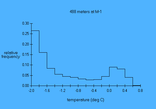 Experiment name: AnSlope 2004-05 Principal Investigator: A.L.Gordon/A.Orsi/R.D.Pillsbury Affiliation: LDEO/TAMU/OSU Mooring name: M-1 Mooring position: 72.097 deg S, 172.695 deg E Instrument depth 488 meters Seafloor depth: 498 meters Times: starts 08 Mar 2004, ends 02 Feb 2005 Time increment: 30 minutes Instrument type: SBE-37 MicroCat parameter min mean max stddev days temp (deg C) -1.90 -1.05 0.68 0.84 330.96 cond (mmho/cm) 27.45 28.16 29.63 0.69 330.96 |