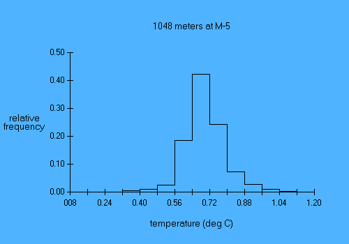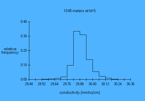 Experiment name: AnSlope 2004-05 Principal Investigator: A.L.Gordon/A.Orsi/R.D.Pillsbury Affiliation: LDEO/TAMU/OSU Mooring name: M-5 Mooring position: 71.907 deg S, 172.922 deg E Instrument depth 1048 meters Seafloor depth: 1749 meters Times: 0600 09 Mar 2004 to 0600 03 Feb 2005 Time increment: 30 minutes Instrument type: SBE-37 MicroCat parameter min mean max stddev days temp (deg C) 0.13 0.70 1.14 0.09 331.02 cond (mmho/cm) 29.40 29.89 30.27 0.08 331.02 The pressure sensor appears to have failed; no useful pressures were recorded. |