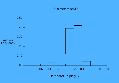 Experiment name: AnSlope 2004-05 Principal Investigator: A.L.Gordon/A.Orsi/R.D.Pillsbury Affiliation: LDEO/TAMU/OSU Mooring name: M-5 Mooring position: 71.907 deg S, 172.922 deg E Instrument depth 1549 meters Seafloor depth: 1749 meters Times: 0630 09 Mar 2004 to 0530 03 Feb 2005 Time increment: 30 minutes Instrument type: Aanderaa RCM8s parameter min mean max stddev days dir (deg true) 0.00 237.50 359.38 88.16 330.98 temp (deg C) -0.85 0.16 0.73 0.17 330.98 The Savonius rotor was lost during deployment. No speeds were recorded. |