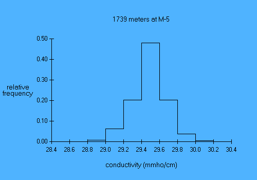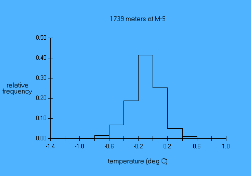 Experiment name: AnSlope 2004-05 Principal Investigator: A.L.Gordon/A.Orsi/R.D.Pillsbury Affiliation: LDEO/TAMU/OSU Mooring name: M-5 Mooring position: 71.907 deg S, 172.922 deg E Instrument depth 1739 meters Seafloor depth: 1749 meters Times: 0600 09 Mar 2004 to 0600 03 Feb 2005 Time increment: 30 minutes Instrument type: SBE-37 MicroCat parameter min mean max stddev days temp (deg C) -1.21 -0.10 0.65 0.21 331.02 cond (mmho/cm) 28.56 29.49 30.14 0.19 331.02 |