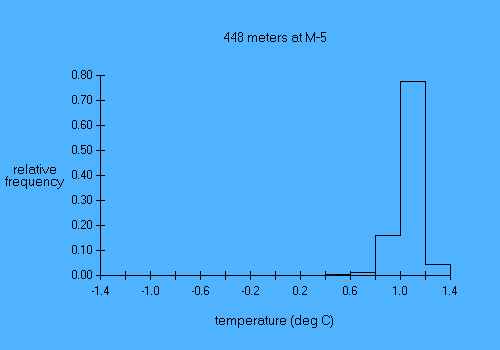 Experiment name: AnSlope 2004-05 Principal Investigator: A.L.Gordon/A.Orsi/R.D.Pillsbury Affiliation: LDEO/TAMU/OSU Mooring name: M-5 Mooring position: 71.907 deg S, 172.922 deg E Instrument depth 448 meters Seafloor depth: 1749 meters Times: 0600 09 Mar 2004 to 0600 03 Feb 2005 Time increment: 30 minutes Instrument type: SBE-37 MicroCat parameter min mean max stddev days temp (deg C) -1.30 1.06 1.30 0.13 331.02 pressure (db) 440.90 461.29 719.60 31.09 331.02 cond (mmho/cm) 27.71 29.95 30.15 0.12 331.02 The pressure record indicates that the mooring slipped about 7 meters downhill between 6 Jan 2005 and 16 Jan 2005. |