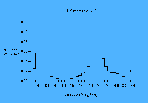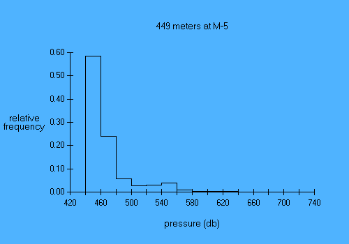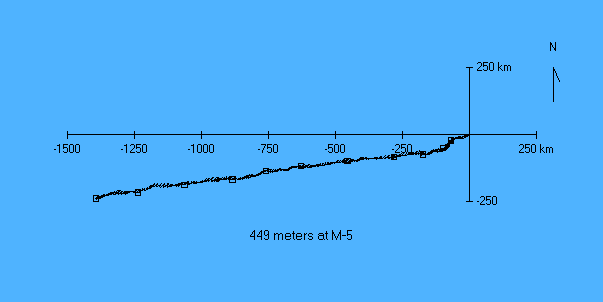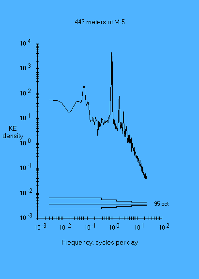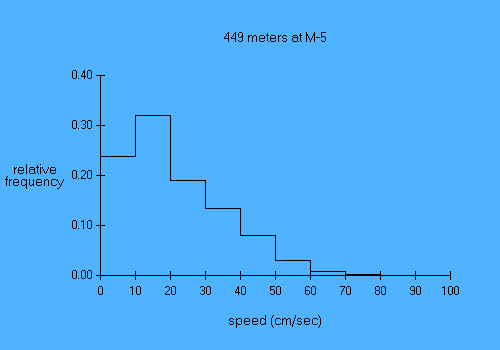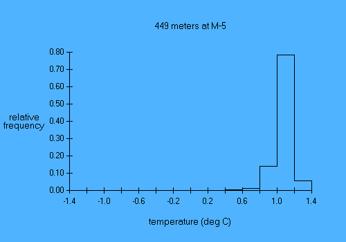 Experiment name: AnSlope 2004-05 Principal Investigator: A.L.Gordon/A.Orsi/R.D.Pillsbury Affiliation: LDEO/TAMU/OSU Mooring name: M-5 Mooring position: 71.907 deg S, 172.922 deg E Instrument depth 449 meters Seafloor depth: 1749 meters Times: 0630 09 Mar 2004 to 0530 03 Feb 2005 Time increment: 30 minutes Instrument type: Aanderaa RCM8s parameter min mean max stddev days speed (cm/sec) 0.92 21.11 84.06 14.03 330.98 dir (deg true) 0.11 177.76 359.83 104.78 330.98 u (cm/sec) -61.41 -4.87 62.14 16.32 330.98 v (cm/sec) -59.62 -0.83 65.94 18.76 330.98 temp (deg C) -1.23 1.07 1.30 0.12 330.98 pressure (db) 449.30 469.50 721.10 30.67 330.98 The pressure record indicates that the mooring slipped about 7 meters downhill between 6 Jan 2005 and 16 Jan 2005. |